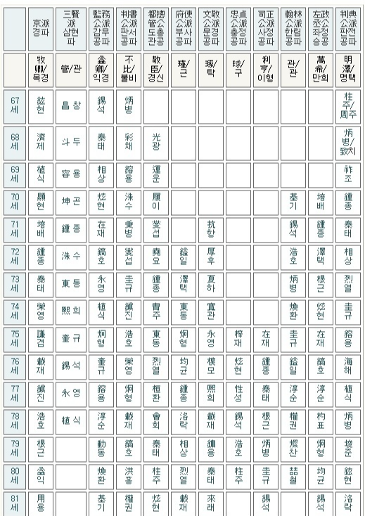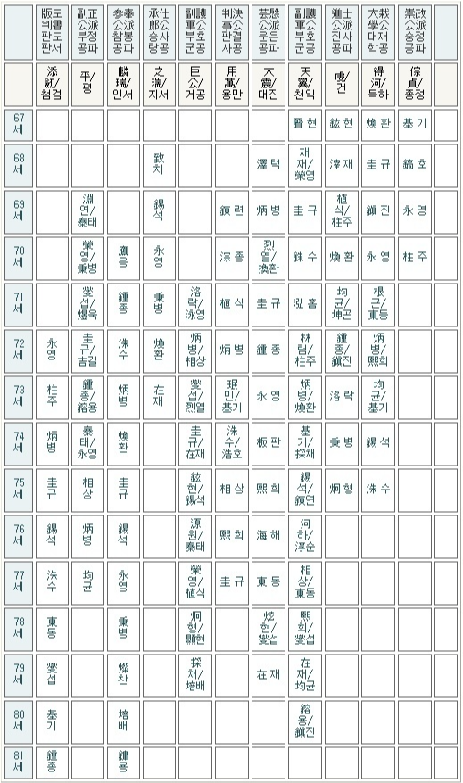 - 주요 돌림자: 현(鉉), 환(煥), 기(基), 택(澤), 치(致), 규(圭), 호(鎬) 등