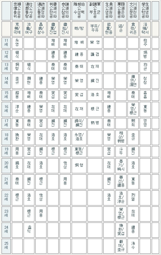 - 각 세수별로 몇 번째 돌림자를 사용할지, 그리고 돌림자로 지정된 한자를 정리한 표가 바로 ‘항렬표’입니다.
