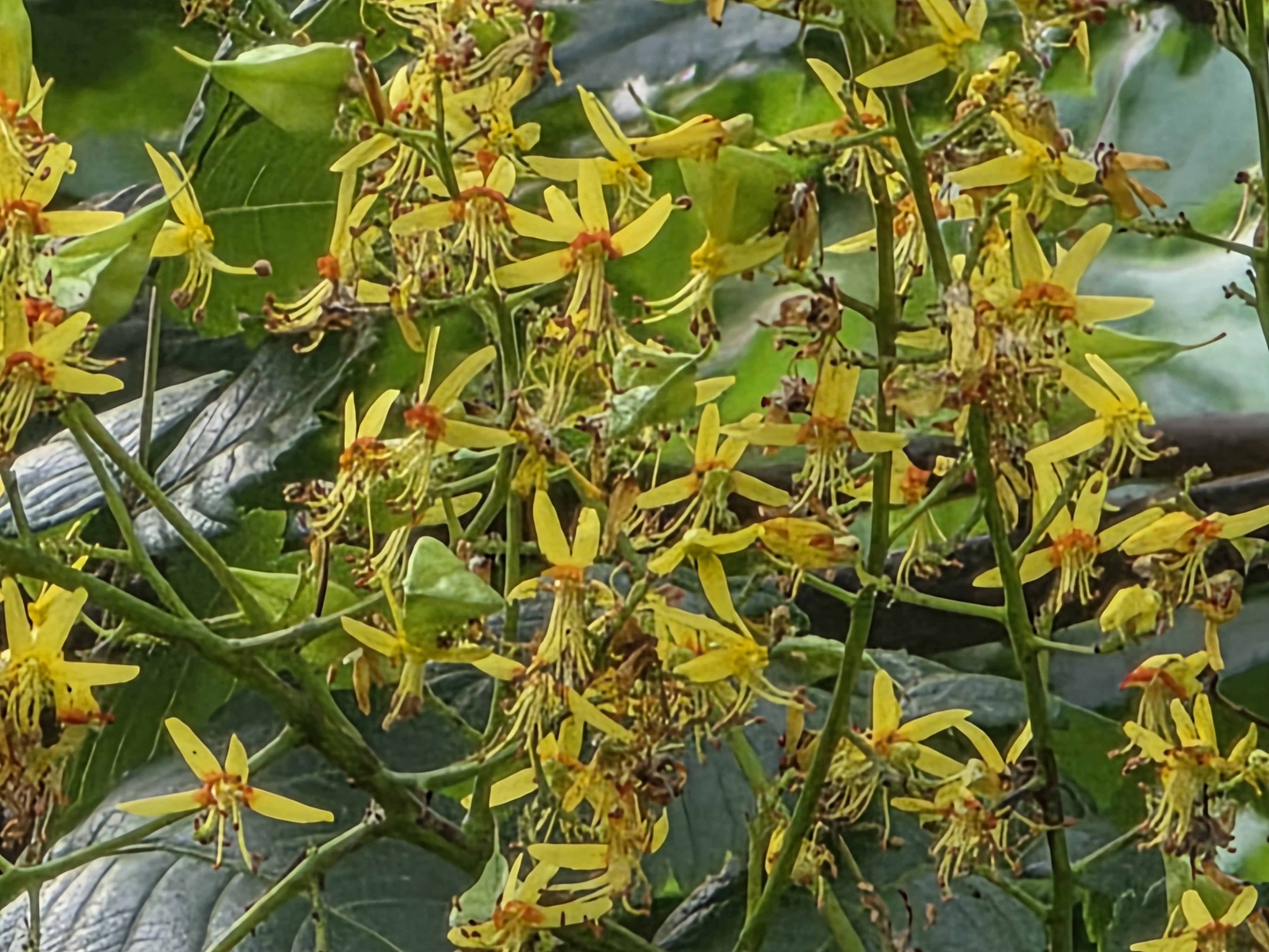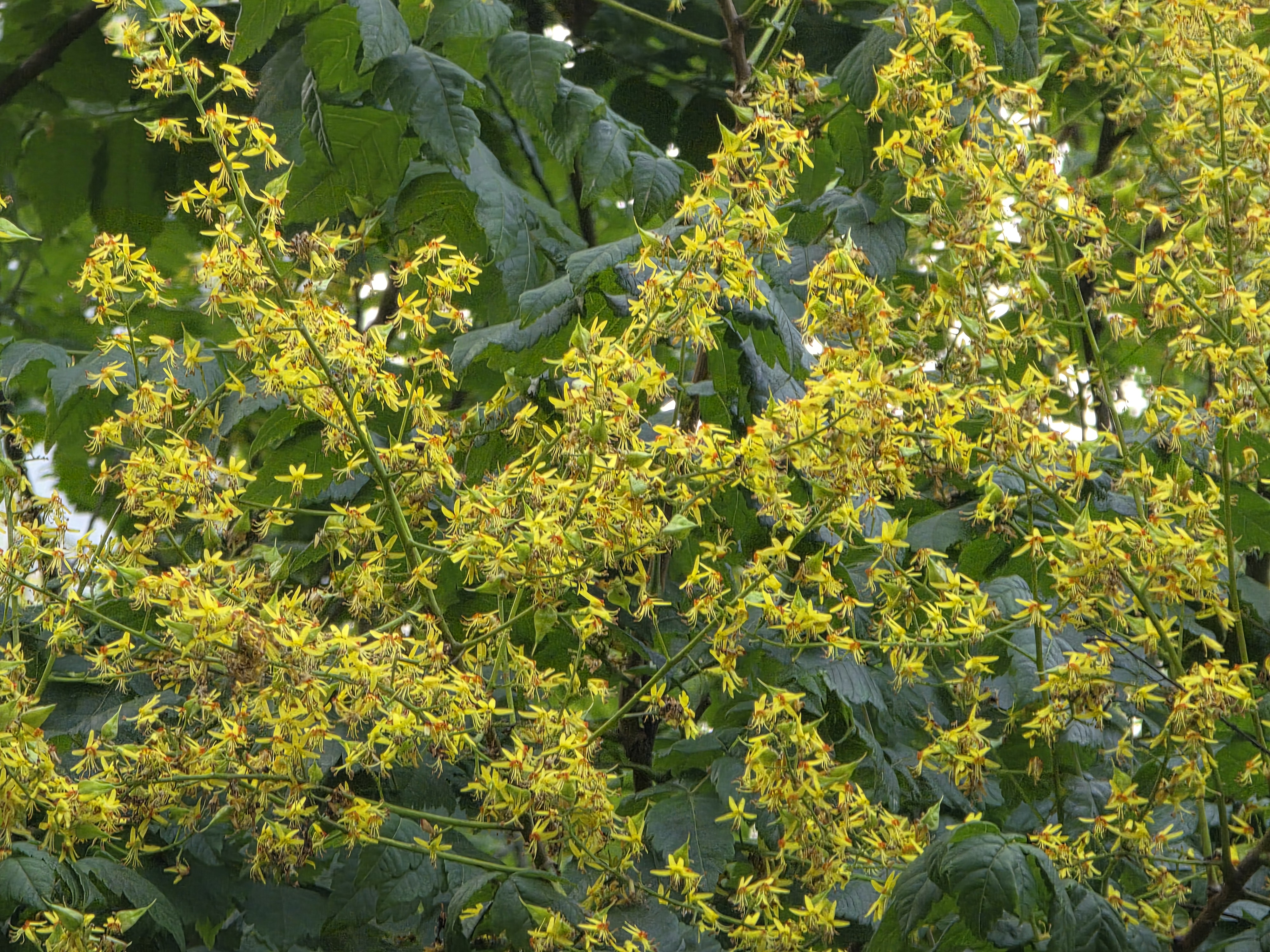 7월 초부터 중순까지, 모감주나무는 황금빛 꽃을 풍성하게 피웁니다. 한 그루의 나무가 온통 노란색으로 뒤덮여 마치 꽃비가 내리는 듯한 착각을 불러일으키죠. 꽃은 4개의 꽃잎을 지니며, 안쪽에는 붉게 물드는 부속체가 있습니다. 한 그루에 수꽃과 양성화가 모두 존재하며, 자가수분을 방지하기 위해 수꽃이 먼저 핀 후, 양성화가 조금 늦게 피는 구조를 갖습니다. 이는 진화적인 관점에서 매우 지능적인 전략으로 볼 수 있습니다.