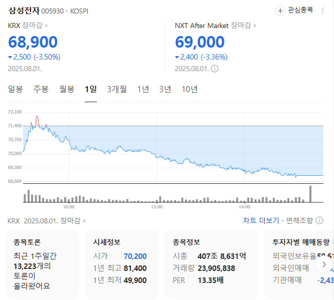 - “2025년 7월 31일 기준 삼성전자 종가는 71,400원으로, 직전 분기 배당락과 2분기 실적 모멘텀 사이에서 등락을 보이는 흐름이었다.”