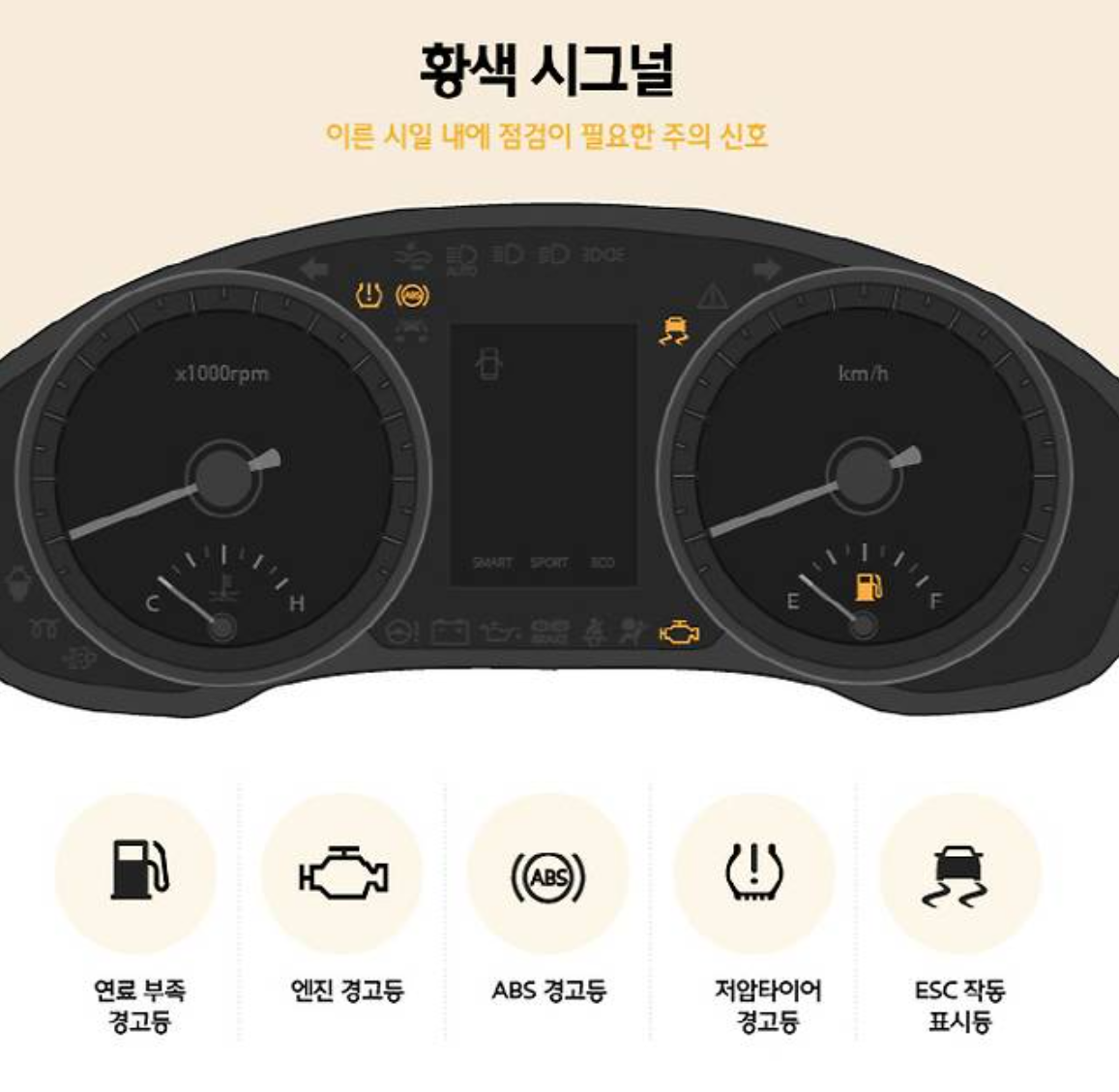 이 색상의 경고등은 당장 큰 위험은 없지만, 문제를 방치하면 고장이나 사고로 이어질 수 있습니다.