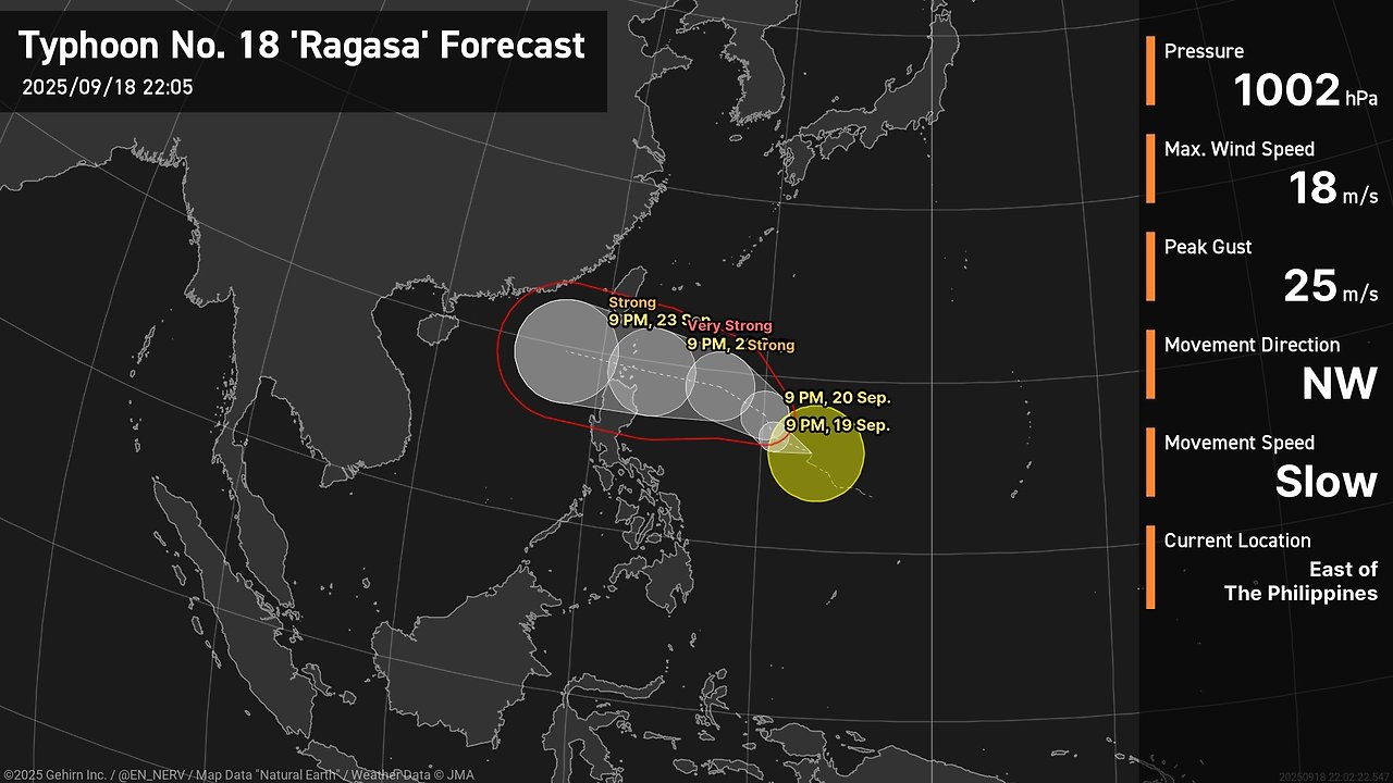 2025년 9월 18일 밤 기준, 라가사는 필리핀 북쪽 해상을 중심으로 서진하고 있습니다. 중심 기압은 985hPa 내외, 중심 부근 최대 풍속은 초속 30m 안팎으로 분석됩니다. 구름대가 태풍 중심부에서 넓게 퍼져 있으며, 외곽 비구름대는 이미 필리핀 루손섬 북부 지역과 대만 남부 해안에 영향을 주고 있습니다.