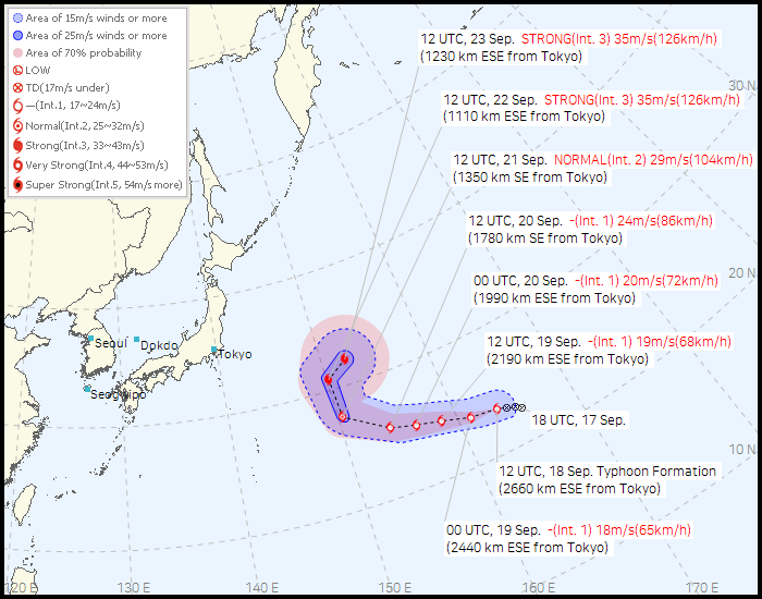 현재까지의 예보에 따르면 라가사는 단기적으로는 서쪽을 향하다가 북서쪽 또는 북쪽으로 경로를 전환할 수 있습니다. 이는 북태평양 고기압의 확장 여부와 시베리아 기단의 남하 시점에 따라 달라집니다.